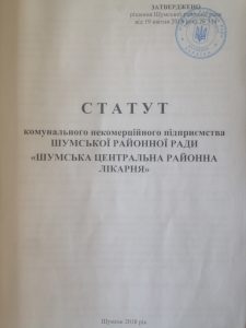 КОМУНАЛЬНЕ НЕКОМЕРЦІЙНЕ ПІДПРИЄМСТВО “ШУМСЬКА ЦЕНТРАЛЬНА РАЙОННА ЛІКАРНЯ” ШУМСЬКОЇ РАЙОННОЇ РАДИ є закладом охорони здоров’я – комунальним унітарним некомерційним підприємством,